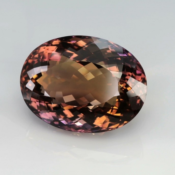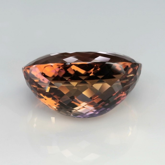 CUT: Cut plays a vital role in how the two colors of Ametrine appear in the crystal. Many prefer the distinct and clear division of the two colors in their crystal and so it is usually cut in regular styles. Some common cuts preferred for Ametrine are Round, Oval, and Pear for smaller crystals; Step, Emerald, Cushion, and Trillion for larger crystals. The Cut of the crystal determines if the bi-colors are visible as a blended shade or as distinct zones. Highly faceted crystals are also more expensive as it requires more precision and it makes the colors more brilliant.