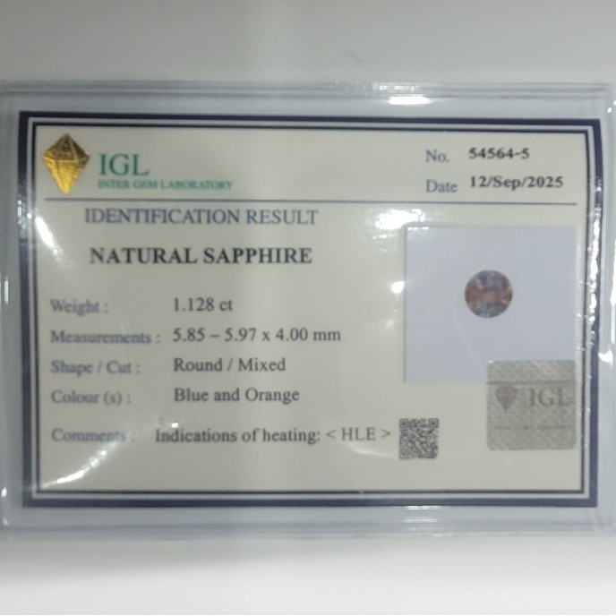 1.12 carats Certified blue orange natural sapphire bi-color round 6x6 mm madagascar